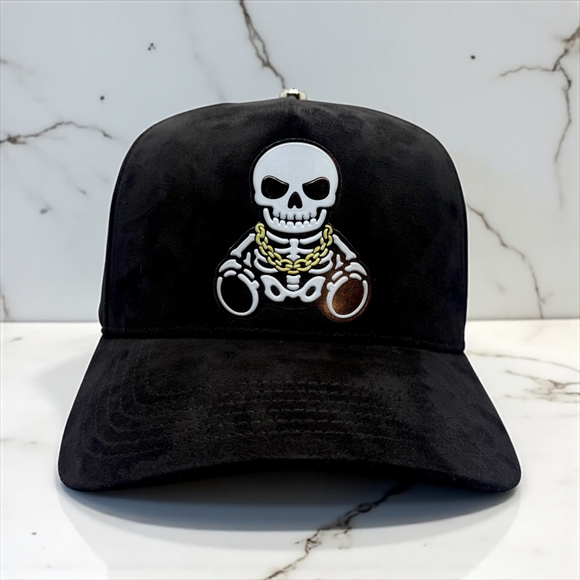 Crafted from black suede fabric, it features a front embroidered skeleton graphic rocking a gold chain, symbolizing power and top-tier confidence.