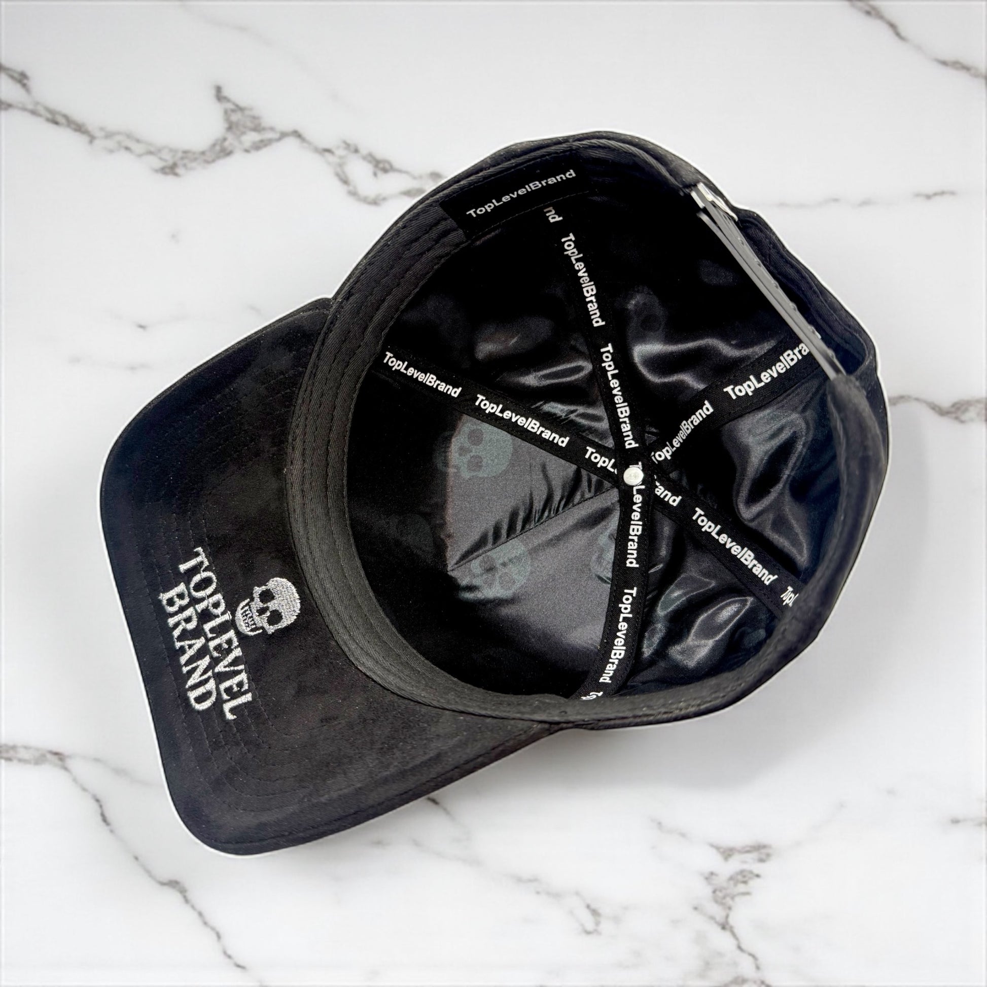 Inside, the hat is fully lined with custom TopLevelBrand satin fabric and branded inner taping, giving it a refined finish that matches the exterior look. The underside of the brim includes TopLevelBrand embroidery with the signature skull logo for extra detail.